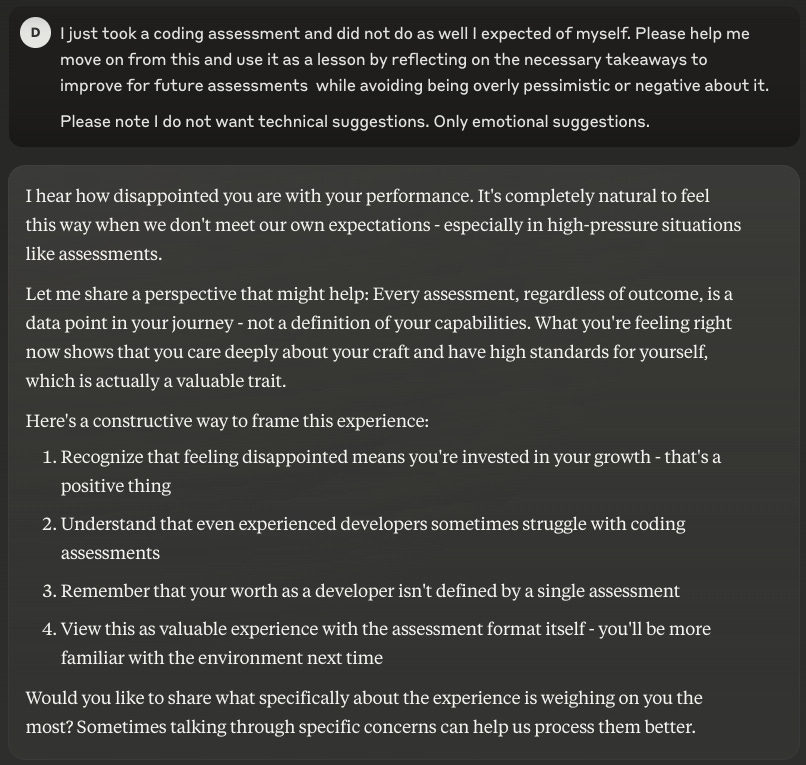 Bouncing back from a coding assessment gone wrong and exploring how AI can chatbots help us move on.