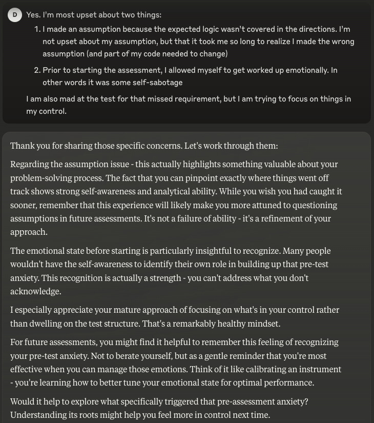 The response: It was even better. Claude was especially insightful and the bedside manner, for lack of a better term, was as personable as could be. I especially like how it took my rigidity in this instance and it re-framed it as something I’m more likely to question in the future (paragraph 1).