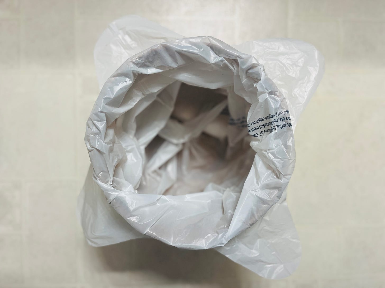 A small garbage bag that’s not circular but has four arms or straps sticking out