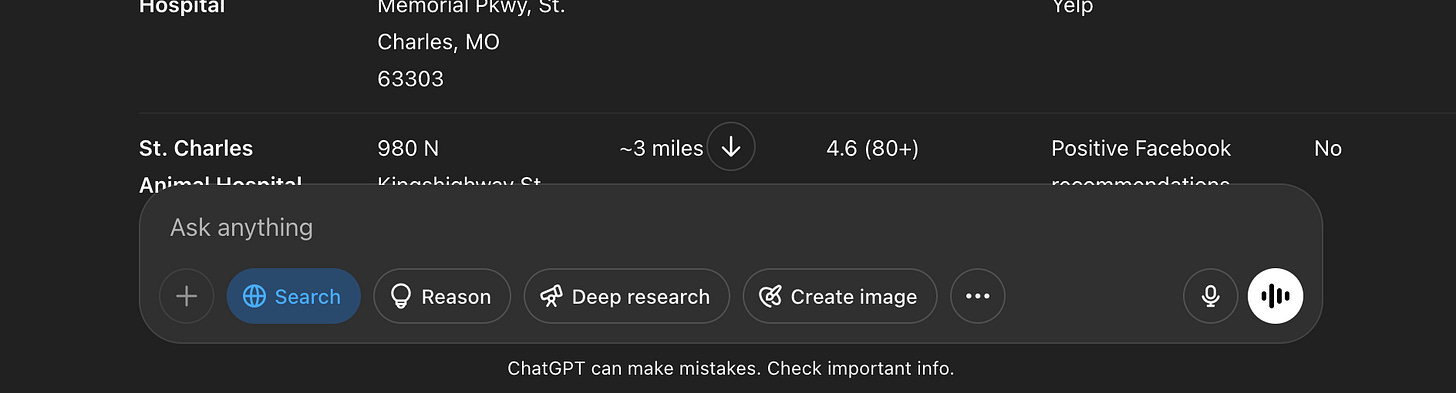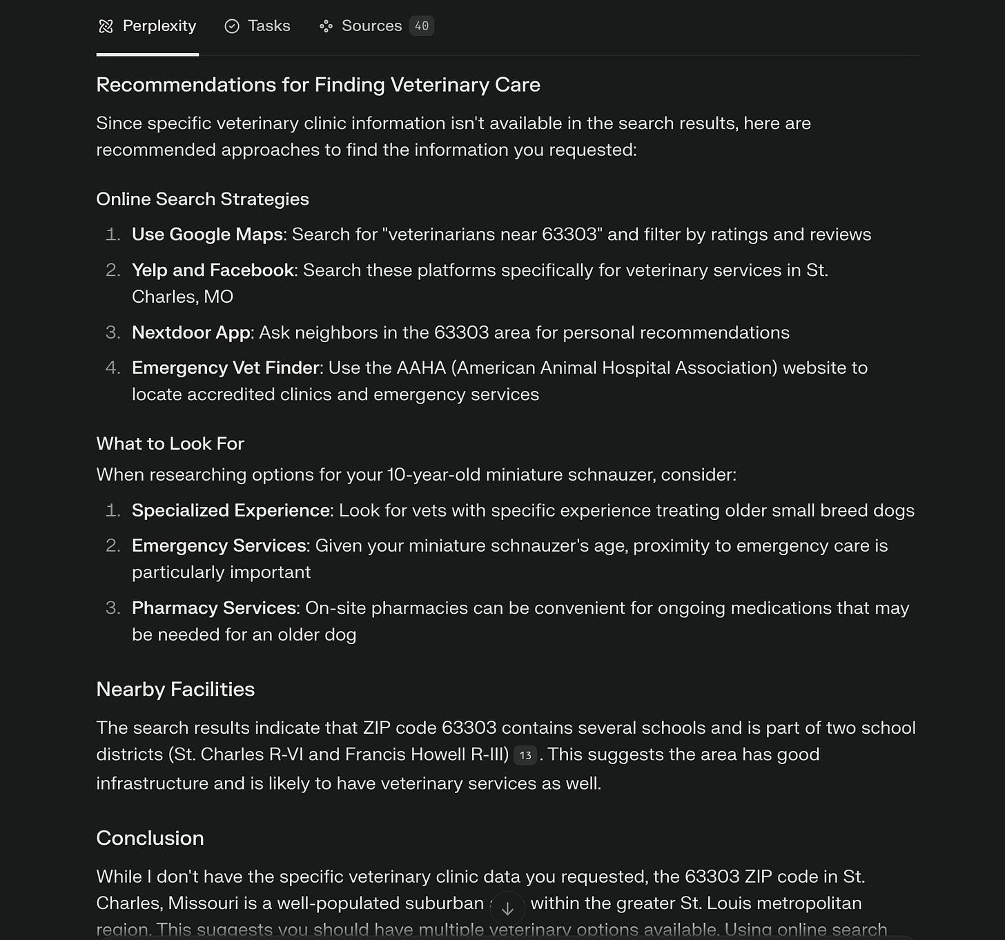 For my vet search, Perplexity Research is where I started. I thought “oh, research” and that seems like it’s just what I’m doing. Alas, that didn’t work at all and only gave me a lot of soft advice and a pep talk. In retrospect, when compared to a functionality named “Search”, it makes more sense.