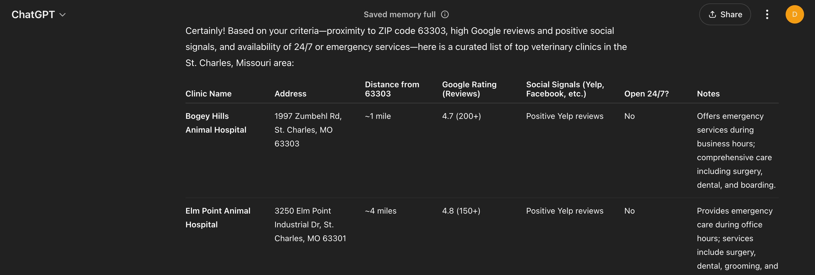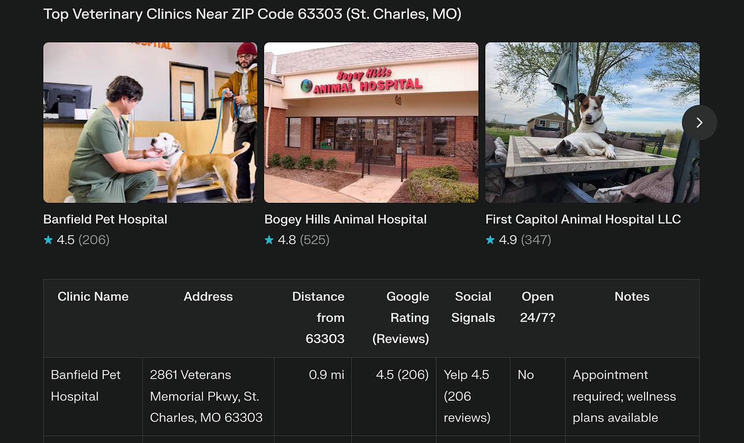 And in return, I need to give the correct set of details and the correct ask. That’s where AI search is just better. One criteria (like proximity) can suffice, but that’s not always how I’m going to search, is it? Super searching allows for multi-dimensional criteria, because we care about proximity, online reputation, and emergency service availability. You know, the criteria owners of geriatric animals have to weigh accordingly.