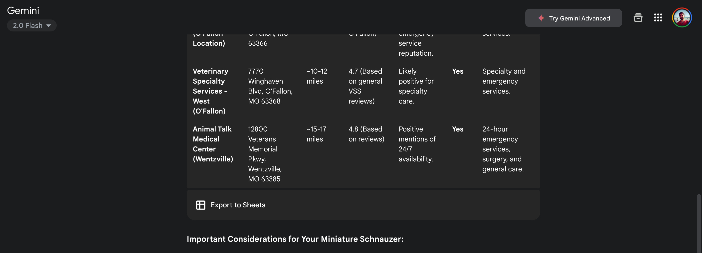Though I did love that Gemini allowed me to export to sheets, it’s result gave me the lowest level of trust in that A) it gave me more listings that were far away and B) it told me ratings of a clinic, but didn’t have any deeper indicators like number of reviews.